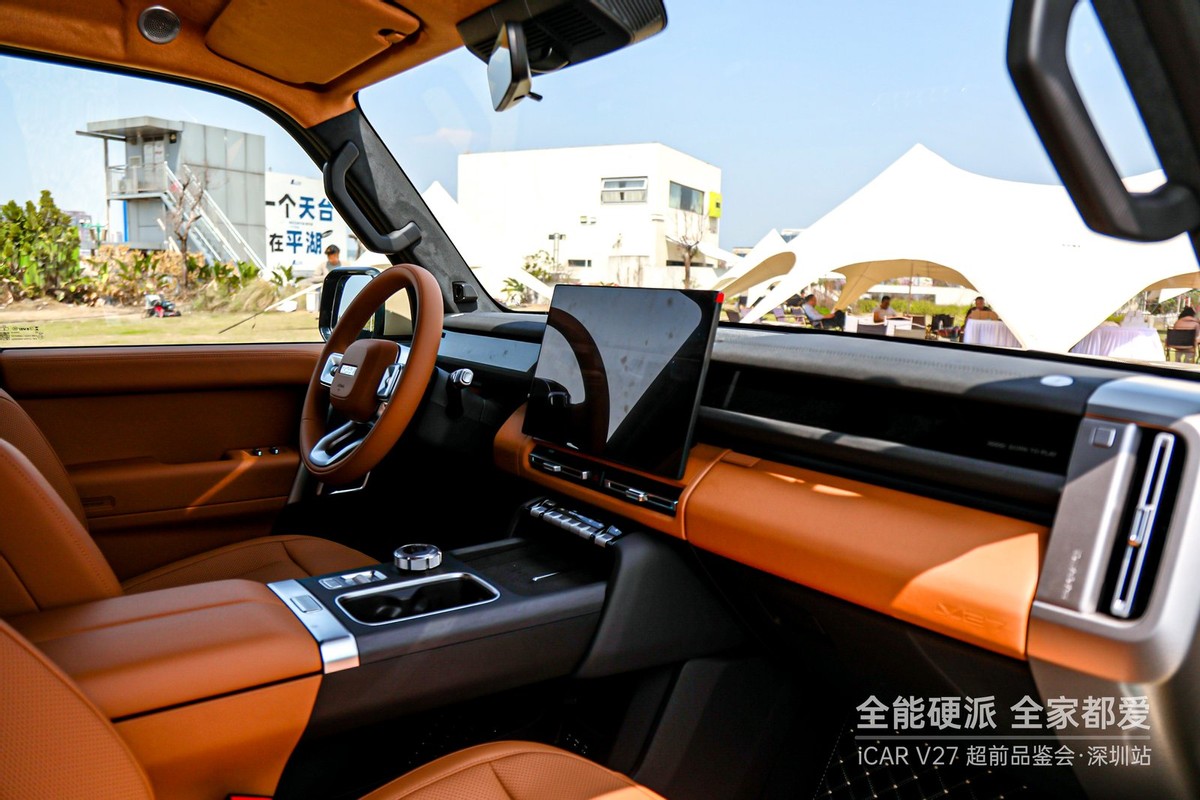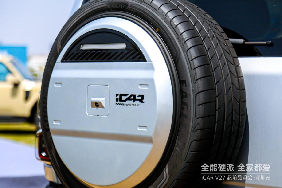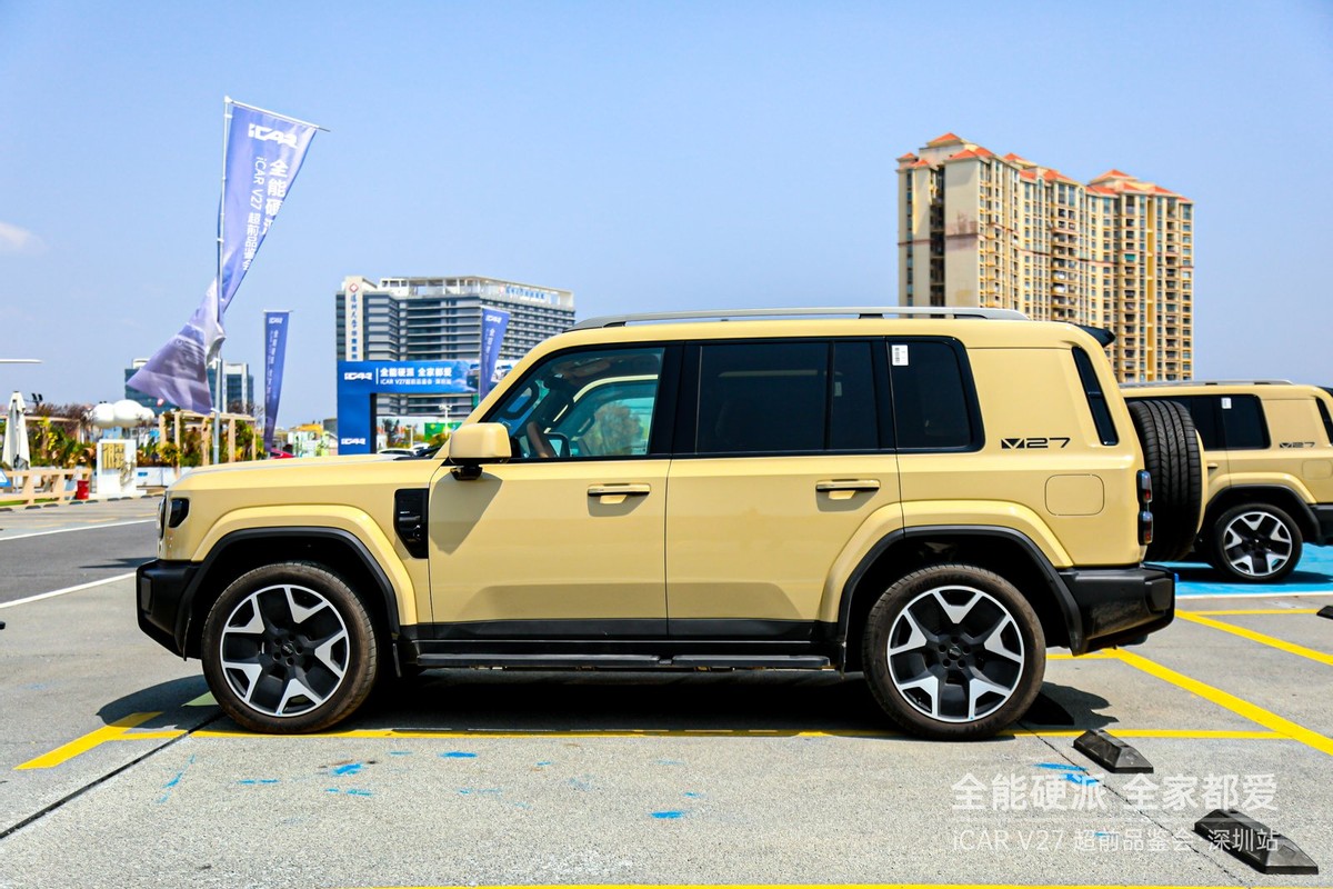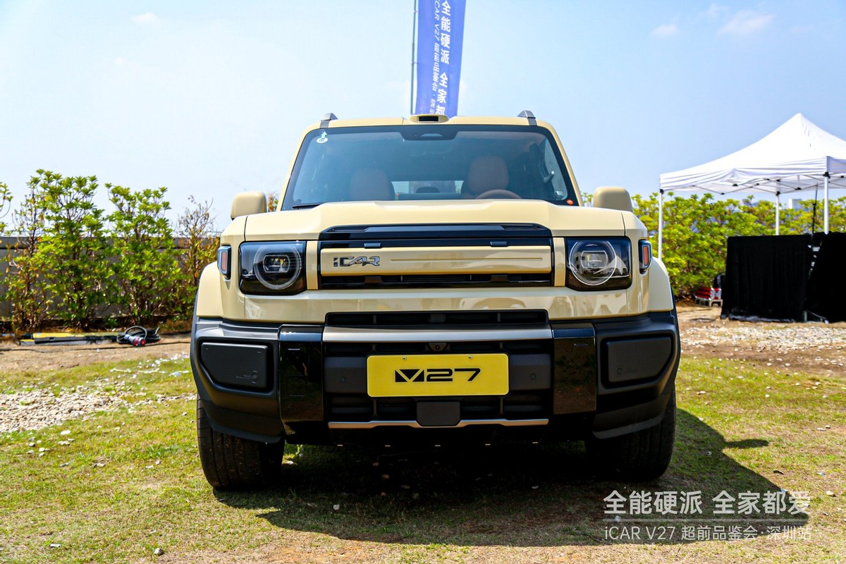 活动现场,V27凭借其极具辨识度的“赛博复古”设计成为全场焦点。许多人曾将其视为“大号V23”,但当实车映入眼帘,其5055mm的车长与2910mm的超长轴距所带来的强大气场,瞬间颠覆了这种简单认知。它继承了家族四轮推向四角的经典比例与圆形复古大灯,但在细节上更显成熟与精致。前脸预留的8处可更换部件以及风挡处预留的射灯改装空间,让每一位“玩家”都能打造专属的个性符号。配合卡其白、沙漠黄等7种潮流配色,V27在硬派粗犷与科技精致之间找到了跨越年龄段的审美平衡,无论都市通勤还是露营营地,都是移动的视觉焦点。