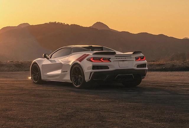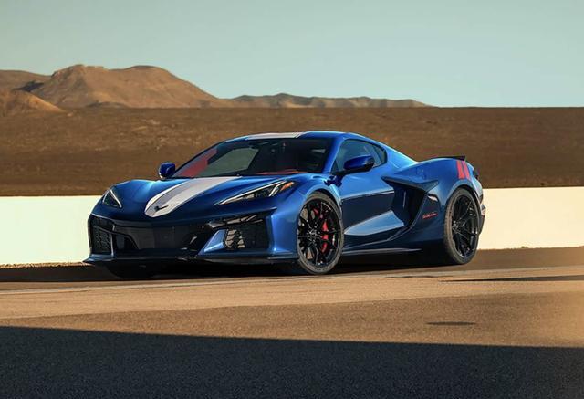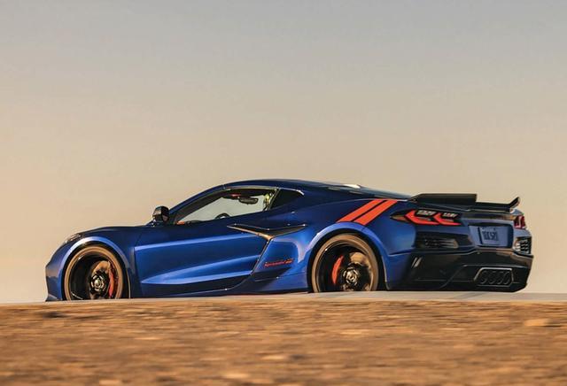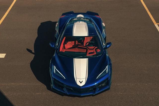 外观方面,新车延续科尔维特家族经典的宽体低趴姿态,整体造型酷炫凌厉,未进行颠覆性改动,重点优化空气动力学细节。车身采用经典的海军上将蓝搭配黑色赛车条纹配色,后轮拱加入红色装饰点缀,同时新增Pitch Gray Metallic深灰色专属车漆,满足个性化需求。前脸处配备轻量化碳纤维前保险杠,搭配锐利的LED大灯组,前唇扰流板经过优化,进一步提升下压力,前包围两侧进气口尺寸加大,为发动机与制动系统提供更好的散热效果。