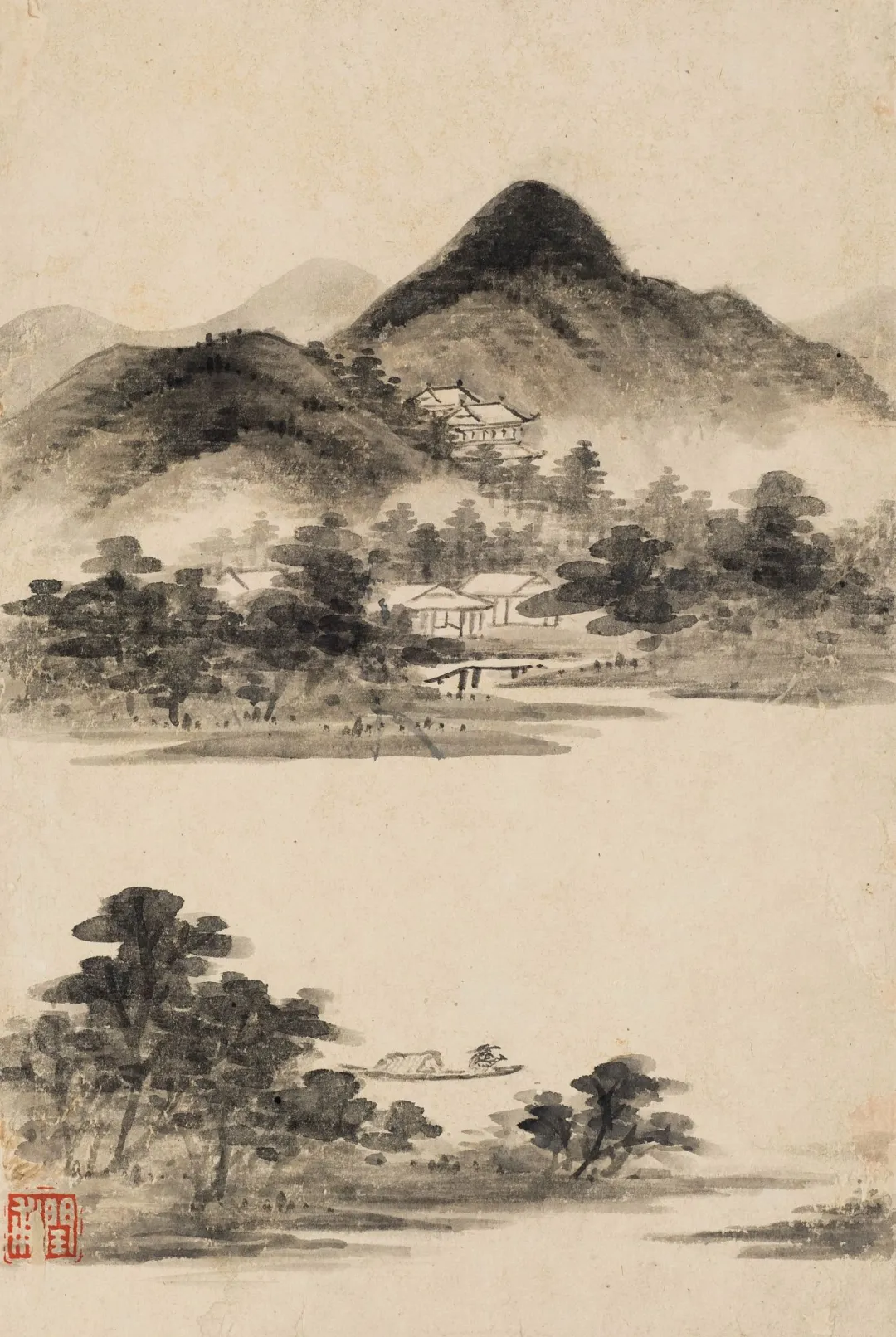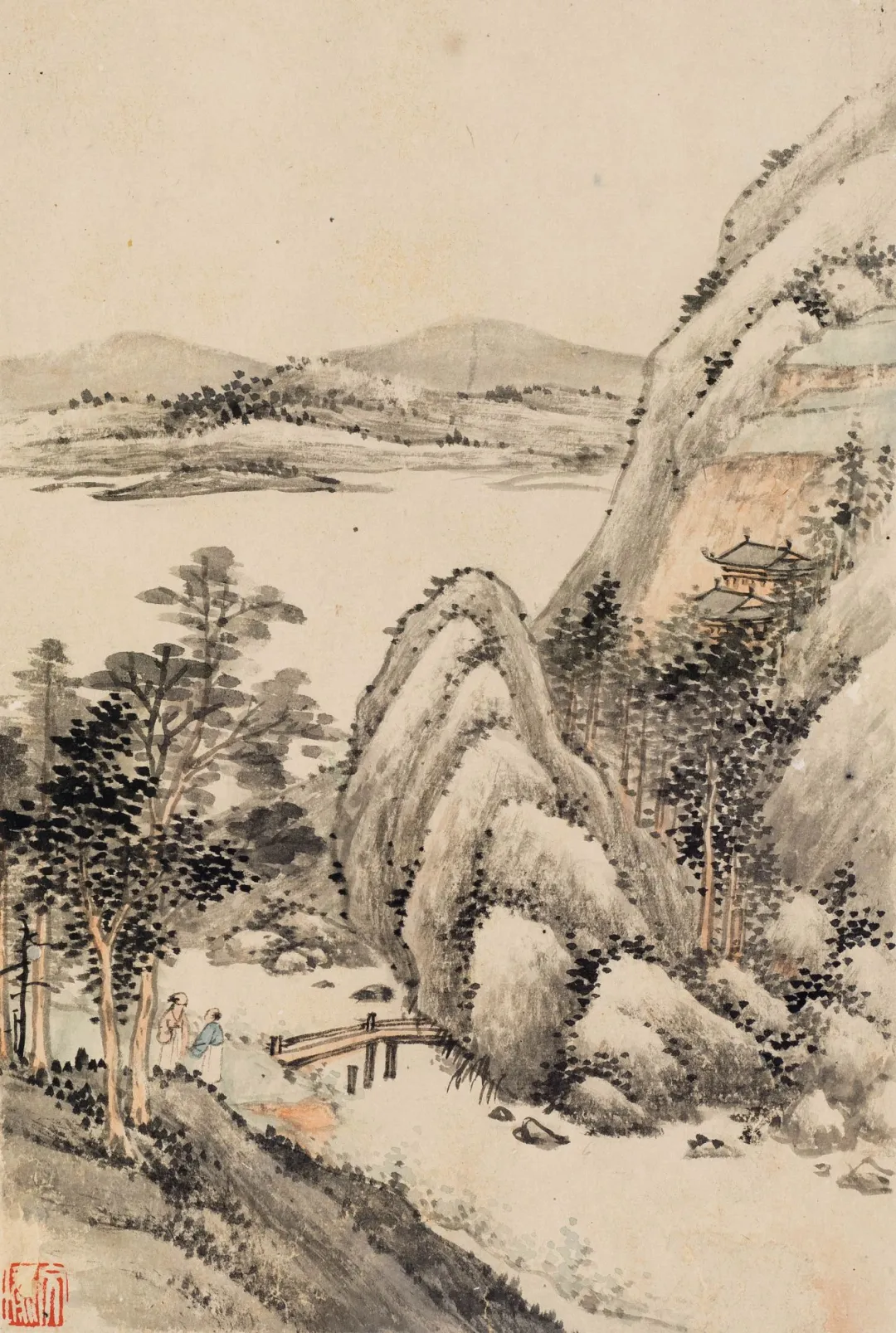 画里的山水,简单却有味道。远山云雾缭绕,像披了层薄纱;近处仙阁清晰,仿佛能听见里面传来的琴声。小桥流水,高士观山,每一处都透着宁静与悠远。